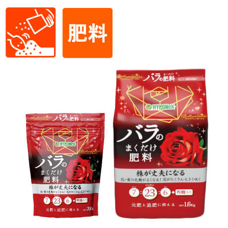 バラの元肥におすすめなのが、ハイポネックス「brilliantgardenバラのまくだけ肥料」です。その名の通り、植え付け・植え替え時に土に混ぜ込めばOK。バラの生育に必要な成分をバランス良く配合し、魚粕類を主体とした有機成分を含むバラ専用の緩効性肥料です。リン酸を多く含んでいるため、根と株を丈夫にし、大きな美しい花を咲かせます。